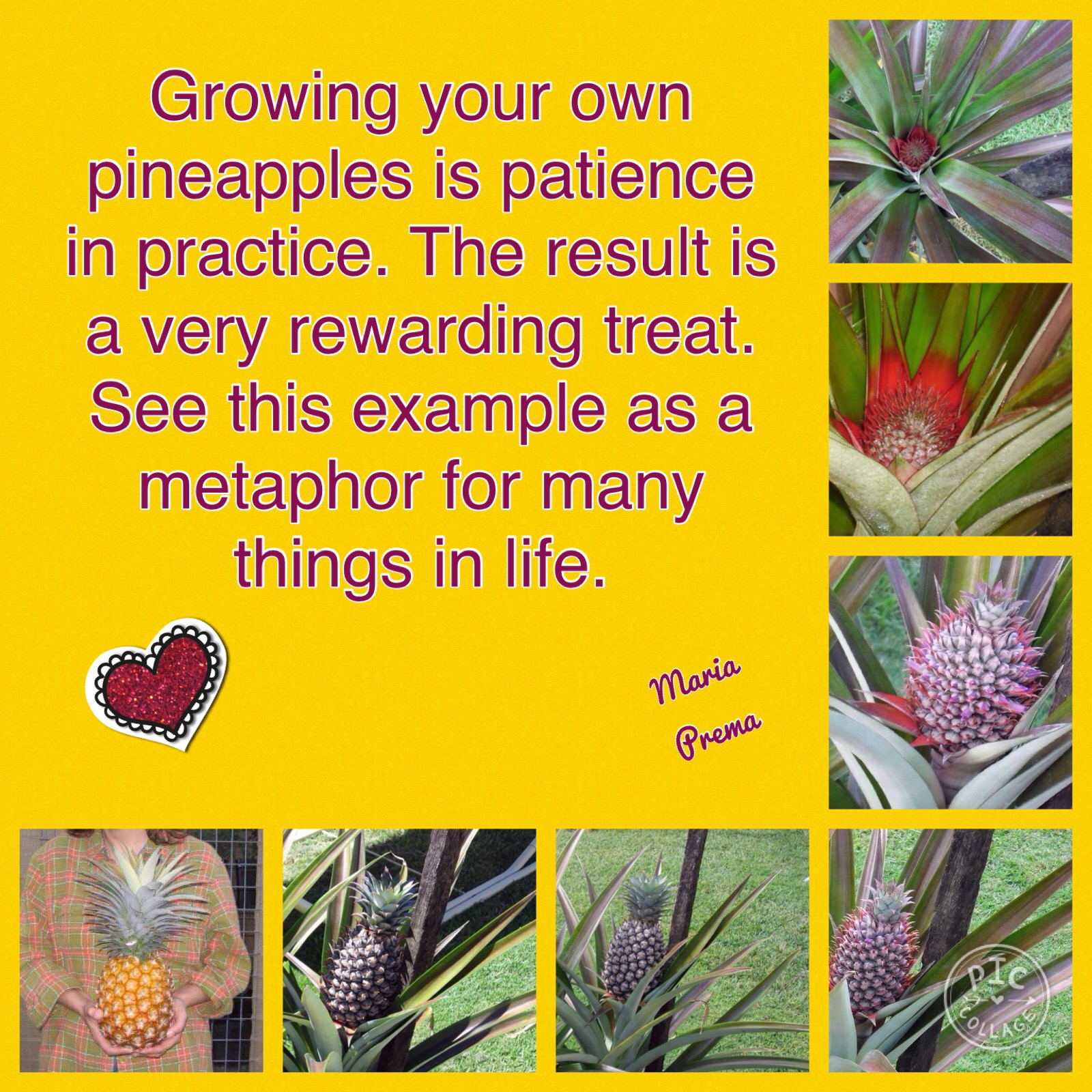 Presently we have three pineapples growing. From the time you cut the top and put it in a pot or directly in the ground is takes about 2 – 3 years for the beautiful red pineapple flower to emerge. Then close to six months until the fruit is ripe, yellow and sweet. You can not rush it!!